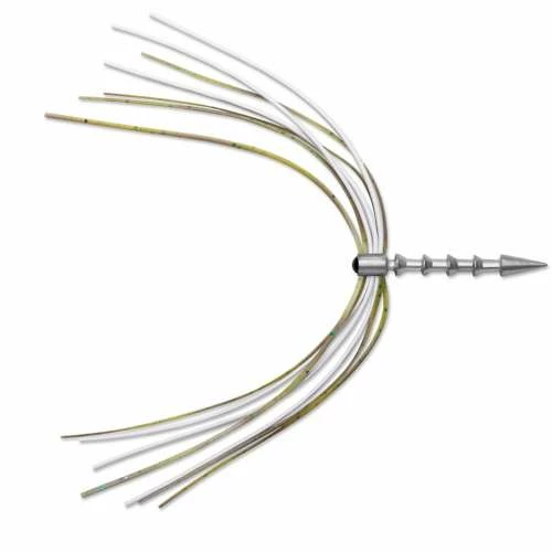 Two-part skirt combining living rubber and silicone material creating a unique action underwater at all temperatures. Conical ribs firmly anchor weight in place without damaging plastic. Epoxy resin end (U.S. Patent Pending) to hold skirts firmly in place.